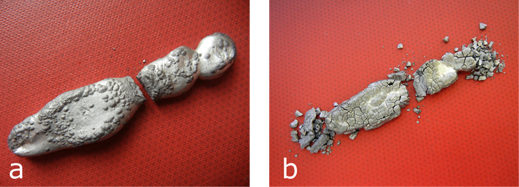 Abb. 2 Erscheinung der Zinnpest nach a) 7 Wochen, b) 5 Monaten (Bilderquelle: illumina-chemie.de/zinnpest)