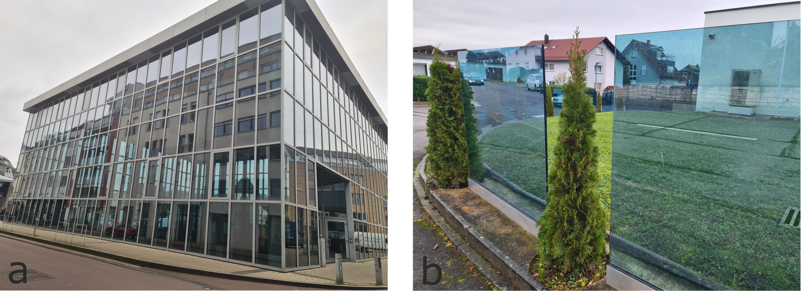 Abb. 1 Anwendungsbeispiele für Glas a) Glasfassade eines Gebäudes, b) Zaun an einem                              Einfamilienhaus