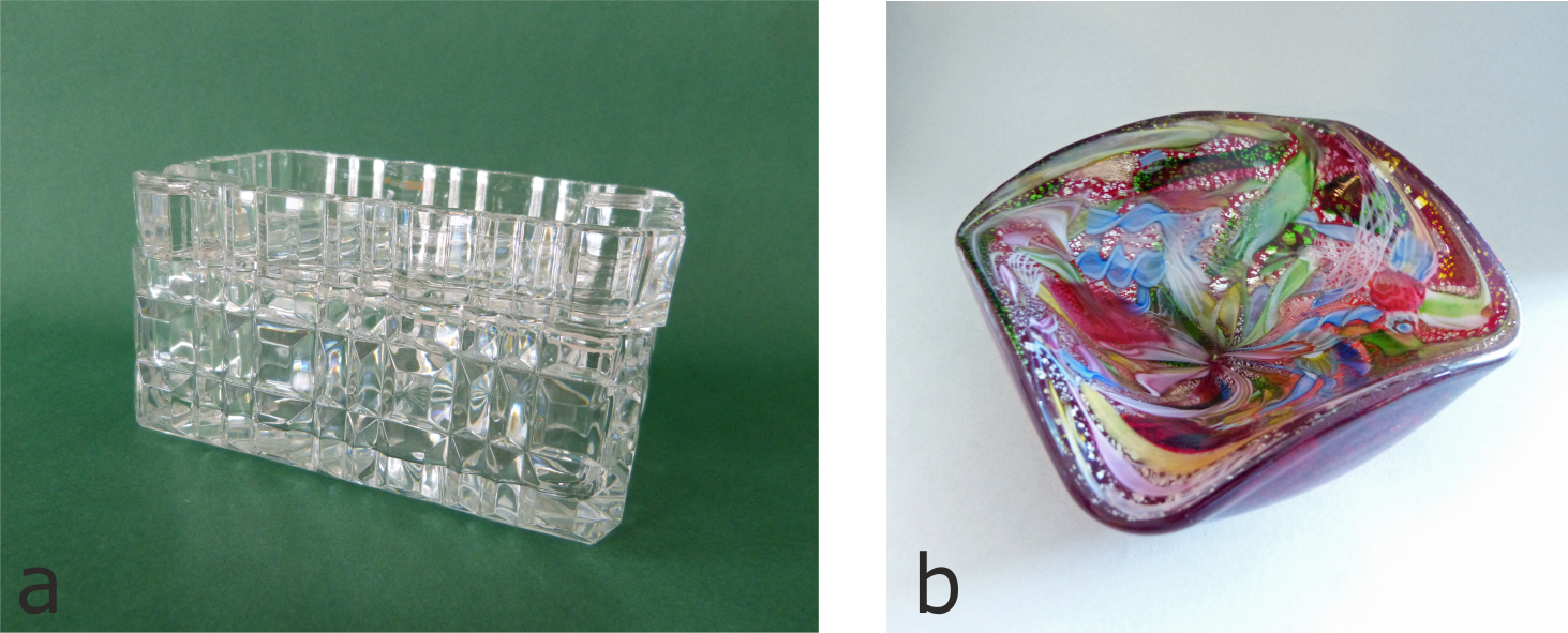 Abb. 2 Anwendungsbeispiele für Glas a) Behälter für Zigaretten aus Kristallglas, b) Schale aus                          Muranoglas