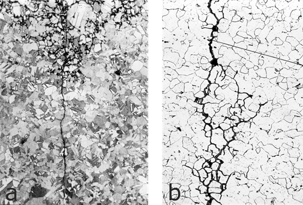 Abb. 1 Spannungsrisskorrosion a) transkristallin, b) interkristallin