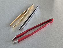 Drei Kosmetik-Pinzetten: zwei herkömmliche aus Stahl und eine ungewöhnliche aus Aluminium. Einsatz von Aluminium wird durch sein geringes Gewicht begründet. Die rote Alu-Pinzette ist länger und leichter als die beiden Stahl-Pinzetten. Mit ihrer abgewinkelten Spitze kann man, nach Angaben des Herstellers, Härchen mühelos zupfen. Die rote Farbe wurde durch Eloxieren erzeugt. Es ist ein spezielles Oberflächenverfahren, das bei Stahl aber nicht angewendet wird.