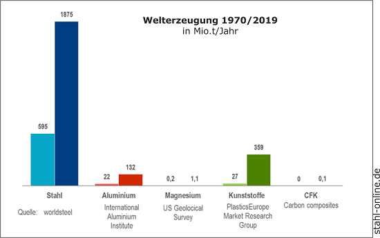 Diese Tatsache ergibt sich aus dem signifikanten Unterschied der Dichte der beiden Werkstoffe. Nach einer einfachen Berechnung: 1 dm³ (sprich Liter) von Stahl entspricht etwa 8 kg und 1 dm³ von Kunststoff wiegt nur etwa 1 kg. Dies bedeutet, dass bezogen auf das Volumen wurden 2019 ca. 235 dm³ Stahl und 360 dm³ - also viel mehr - Kunststoff produziert.